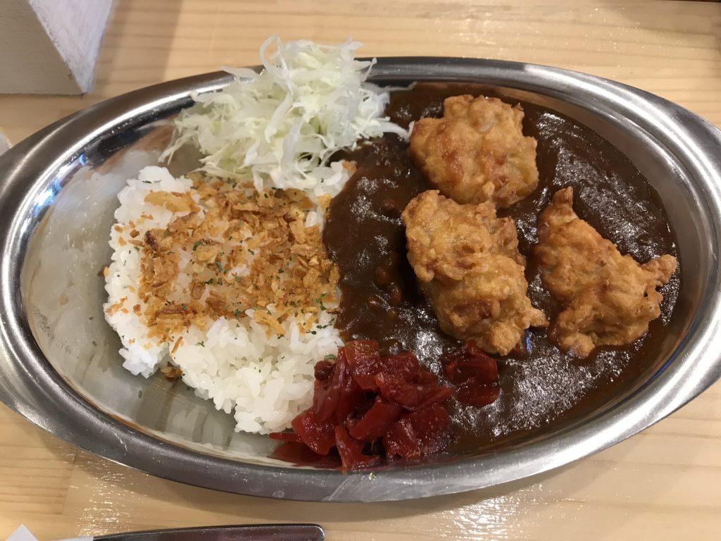こちらが唐揚げカレー(850円)です。食べてみると少し辛めのカレーでほとんどの席が立ち食いで850円は高いですね。